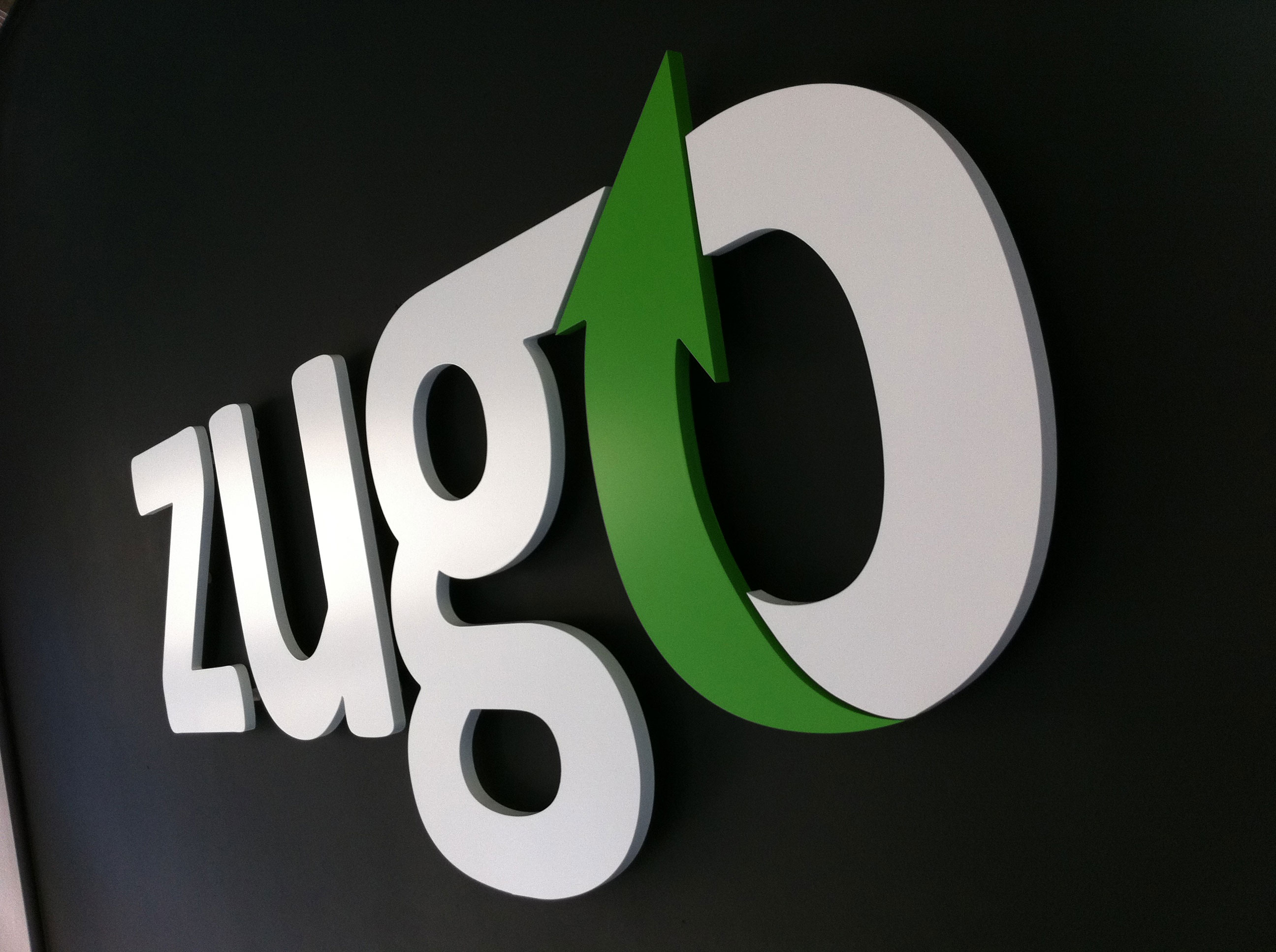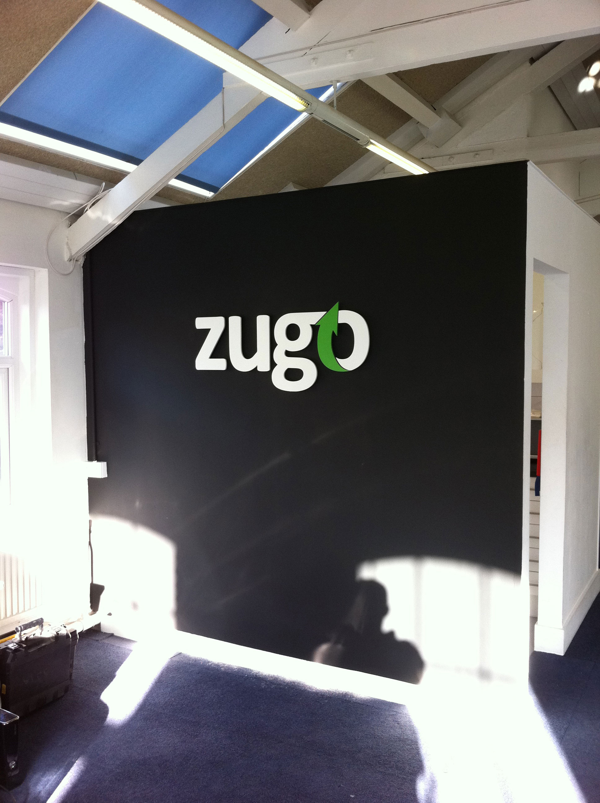 Matt finish logo sign in two colour plastic fixed to black feature wall. Stuck with double sided film.