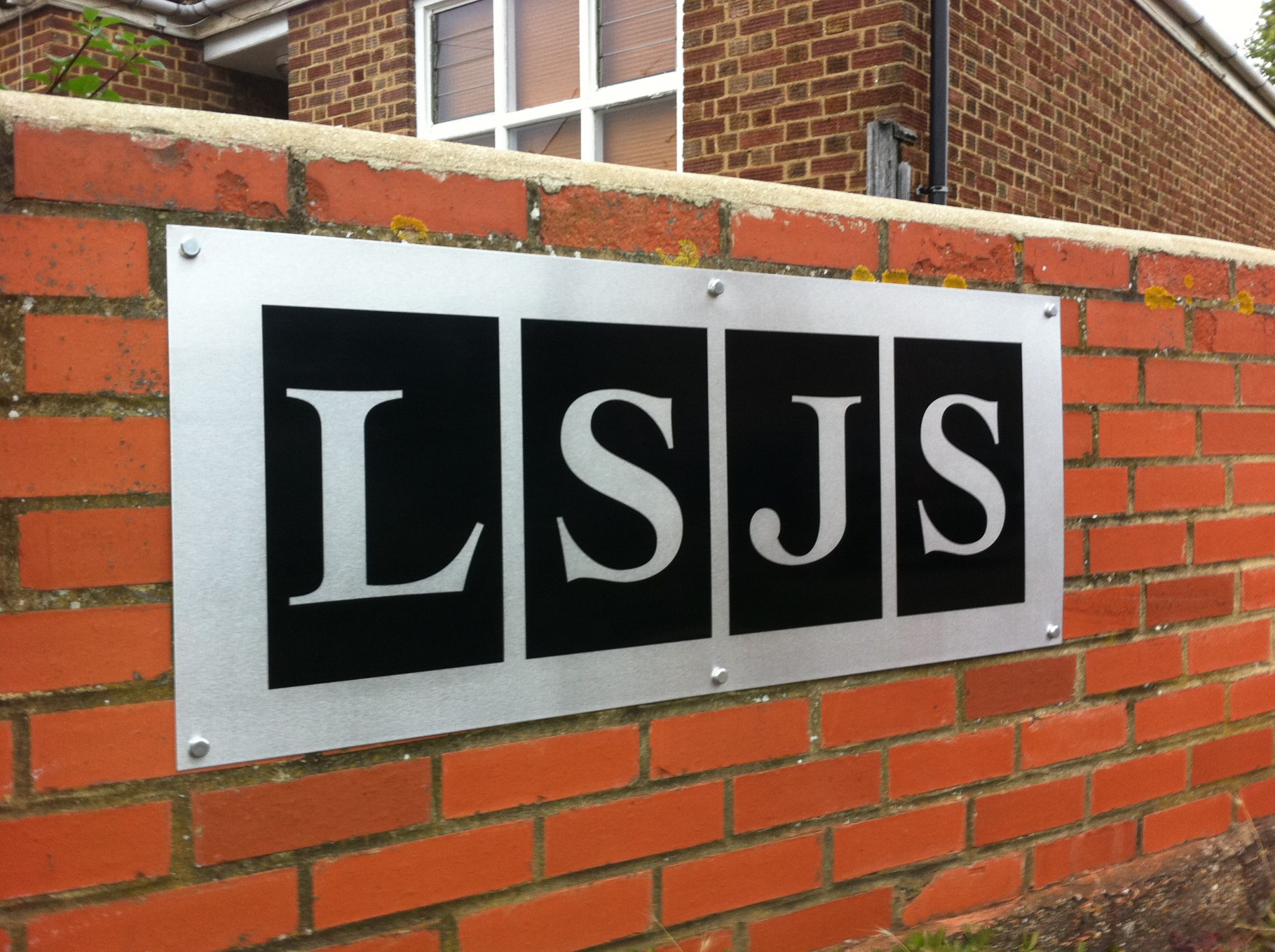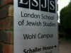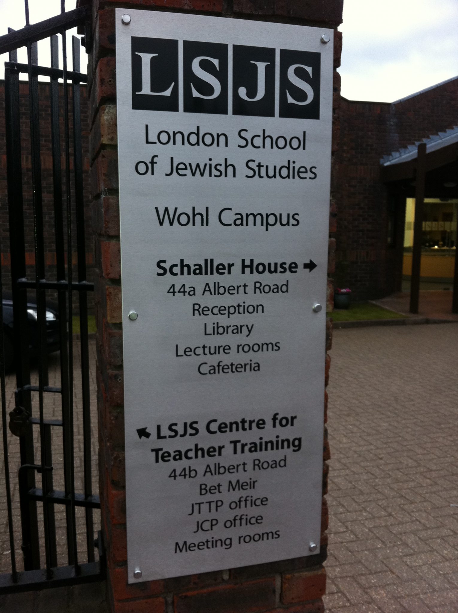 Brickwork Pillar Sign Black vinyl graphics on metal sign on pillar for London School of Jewish Studies. Building SignsPlaques Share this sign
