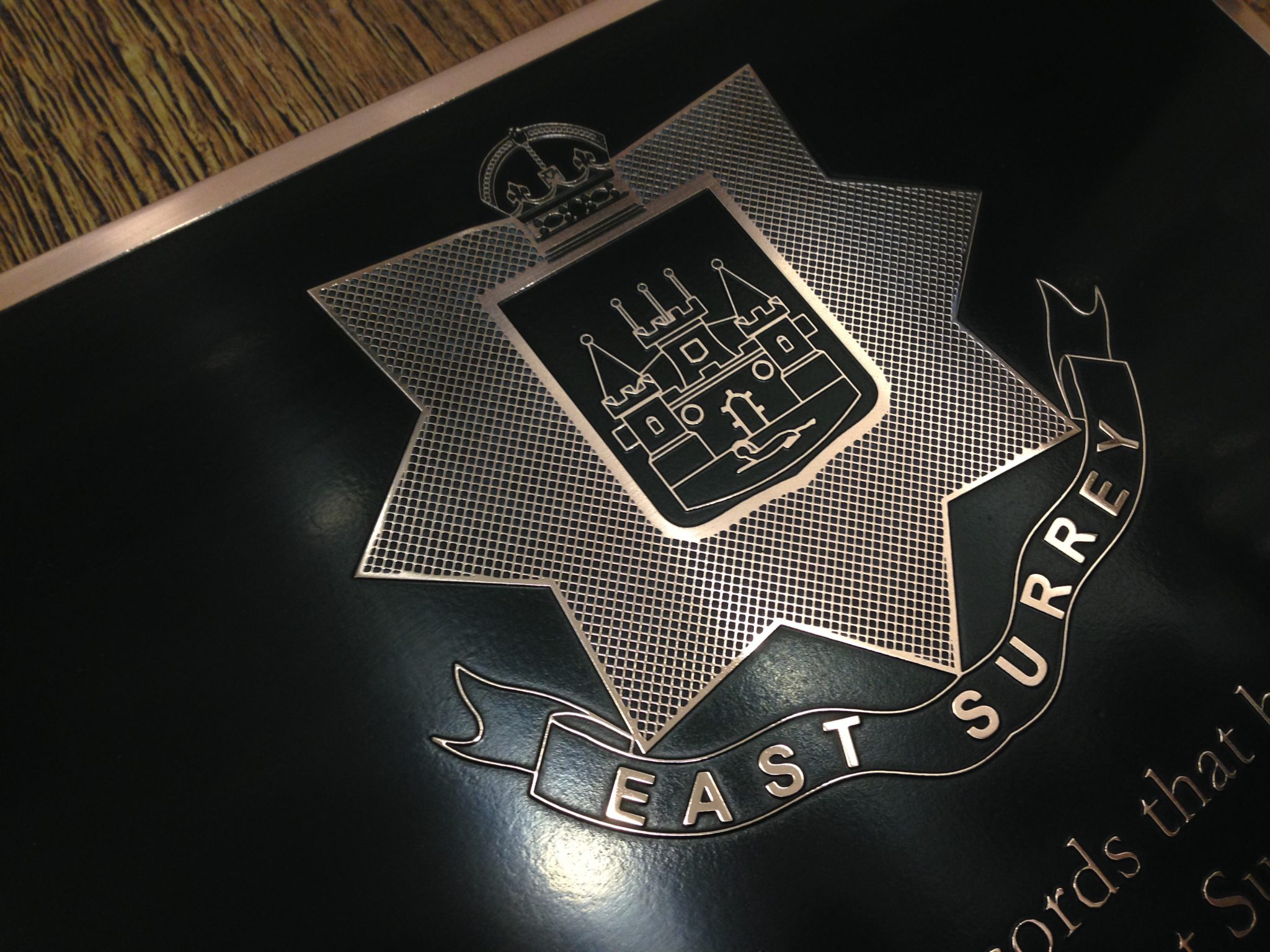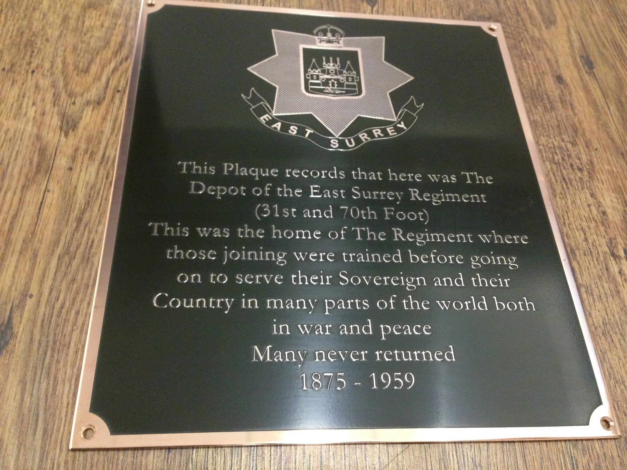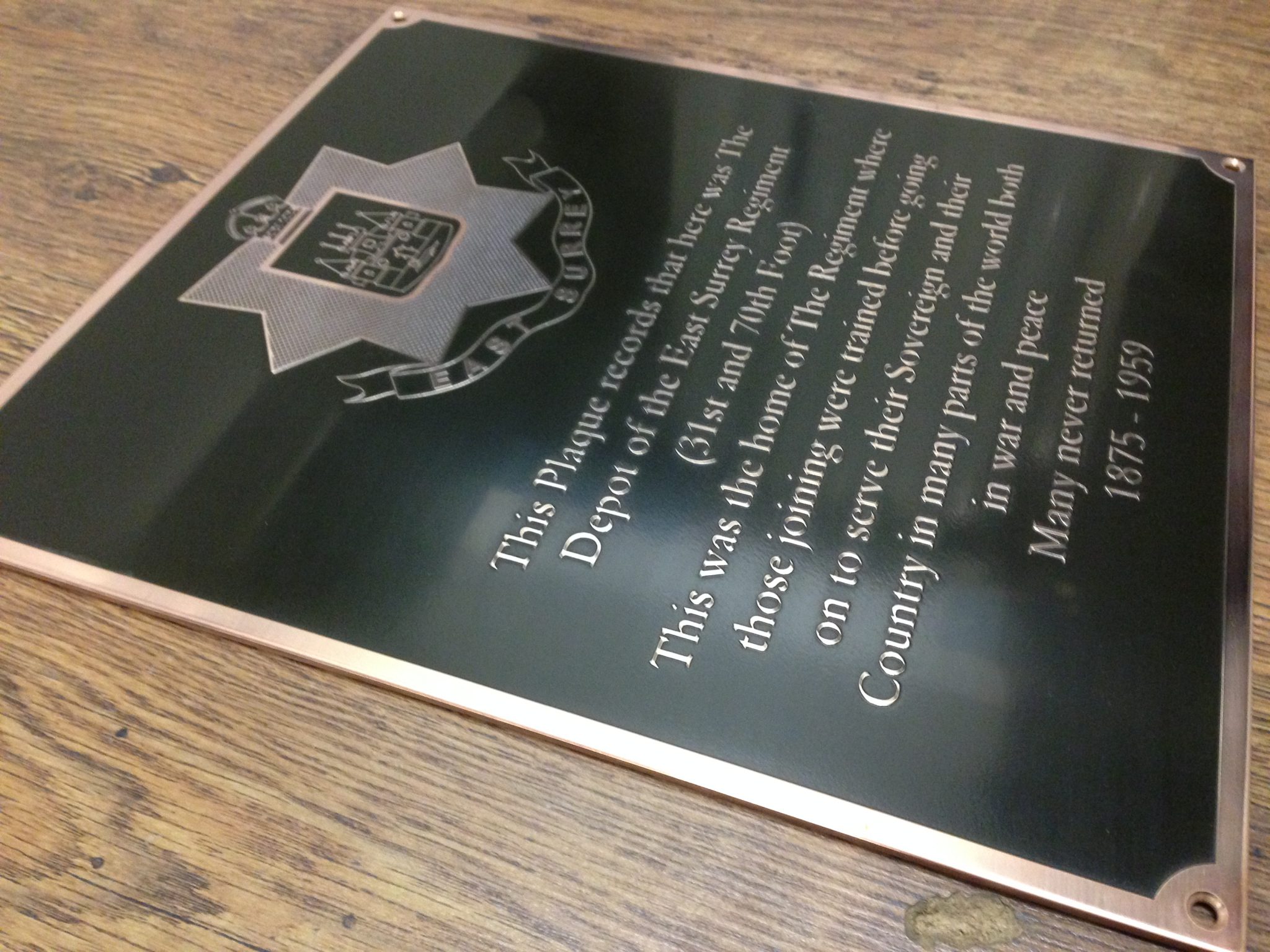 Commemorative Plaque Commemorative message shown in embossed detail with gloss black enamel filled background on solid bronze plate for East Surrey army regiment. Door SignsPlaques Share this sign