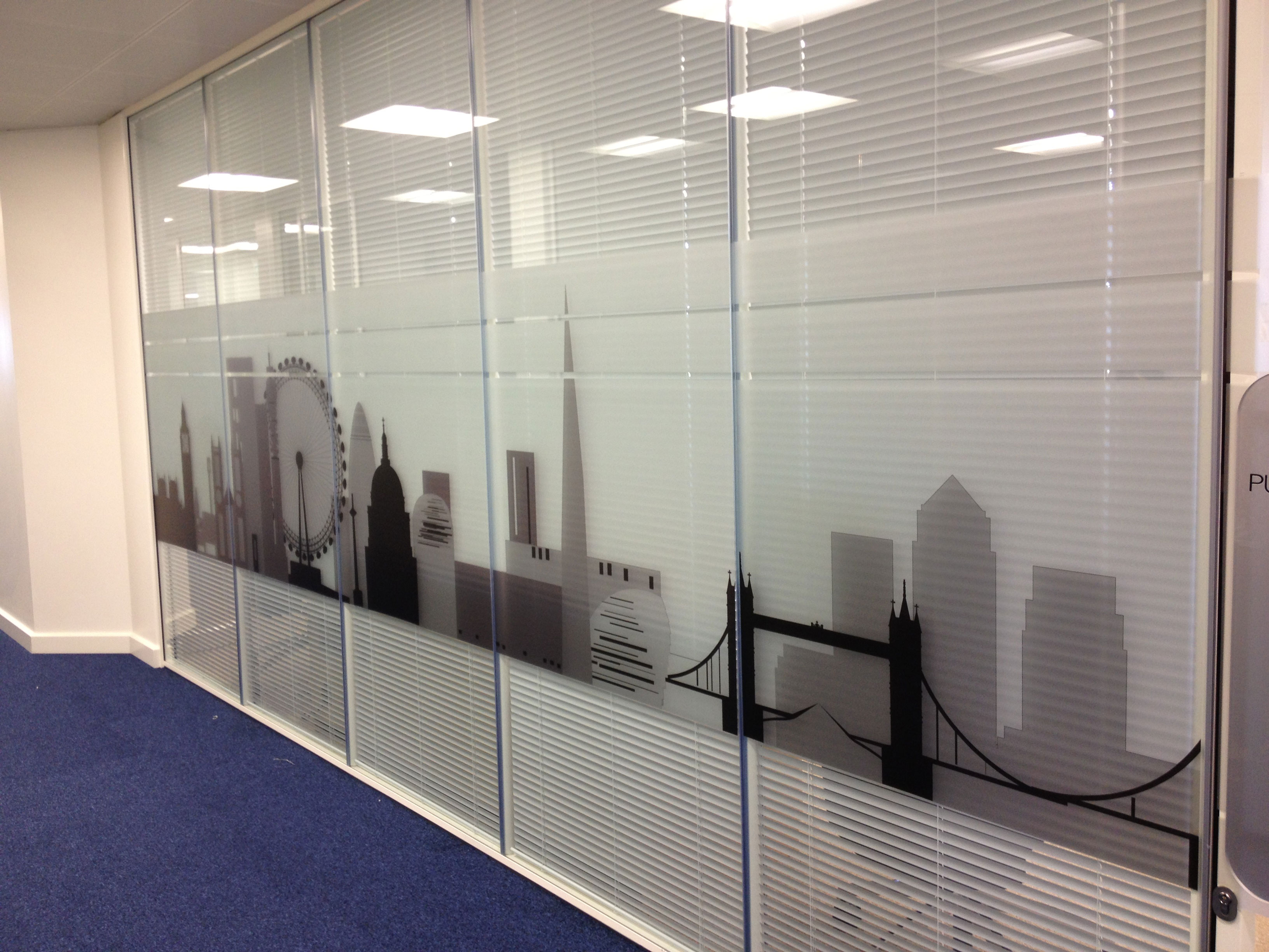 Digitally printed frosted manifestations help you to depict more detailed images and scenes within your internal office space. Canada Life chose to pick out the skylines of the cities in which they are located globally on various of their internal office glass partition walls.