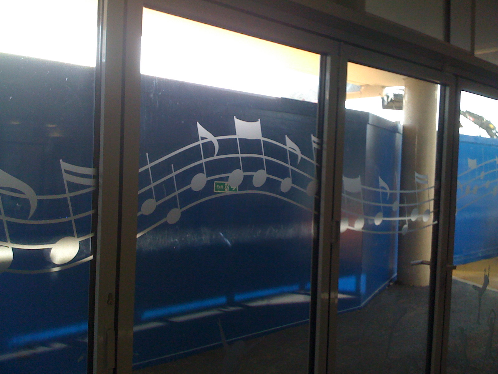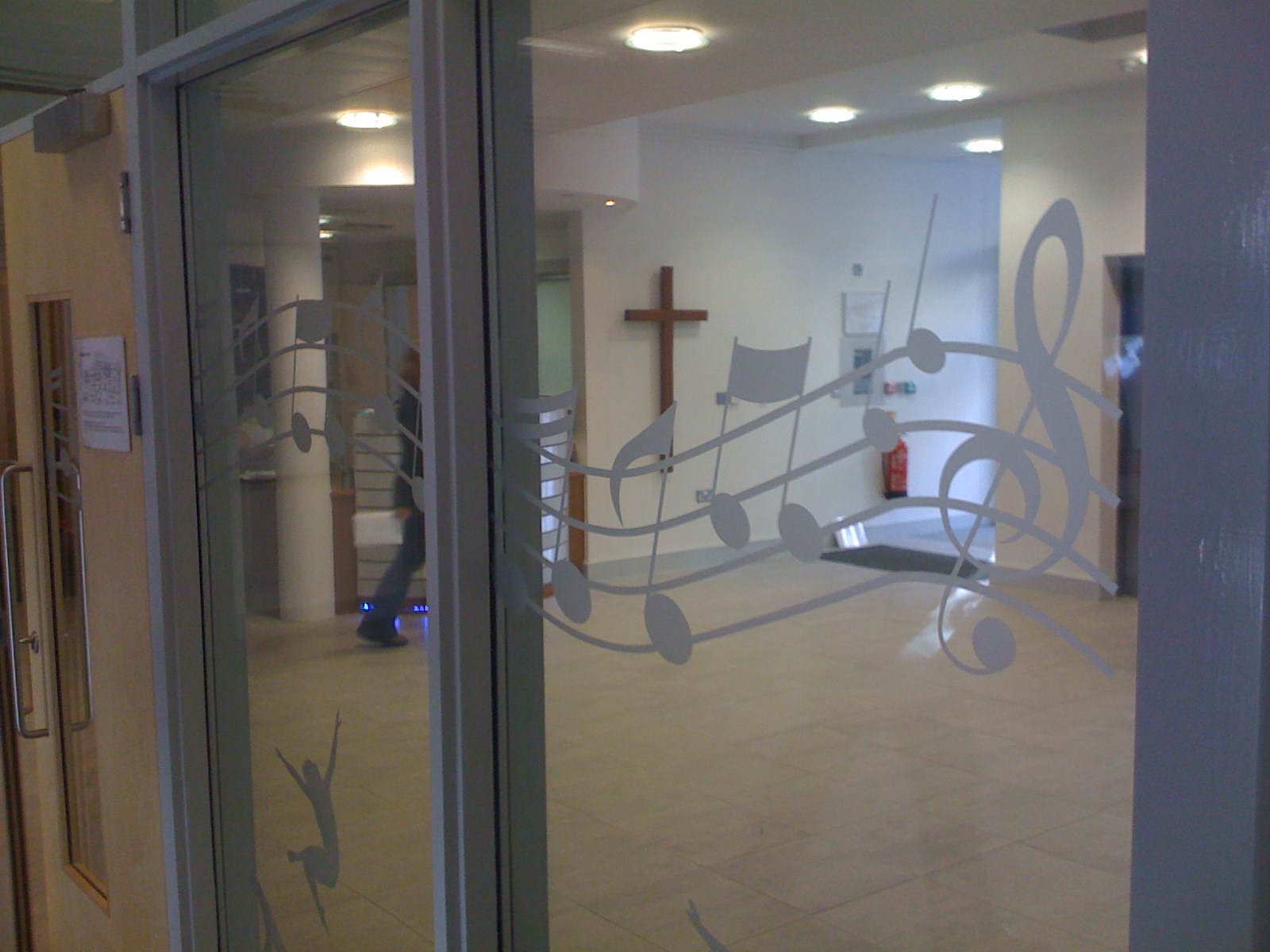 Window frosting film can add decoration and novelty to what would otherwise be plain glass surfaces. Patterns such as this also fulfil basic health and safety requirements by drawing attention to the panel of glass. In this case we added a continuous pattern of musical notation in frosted window film.