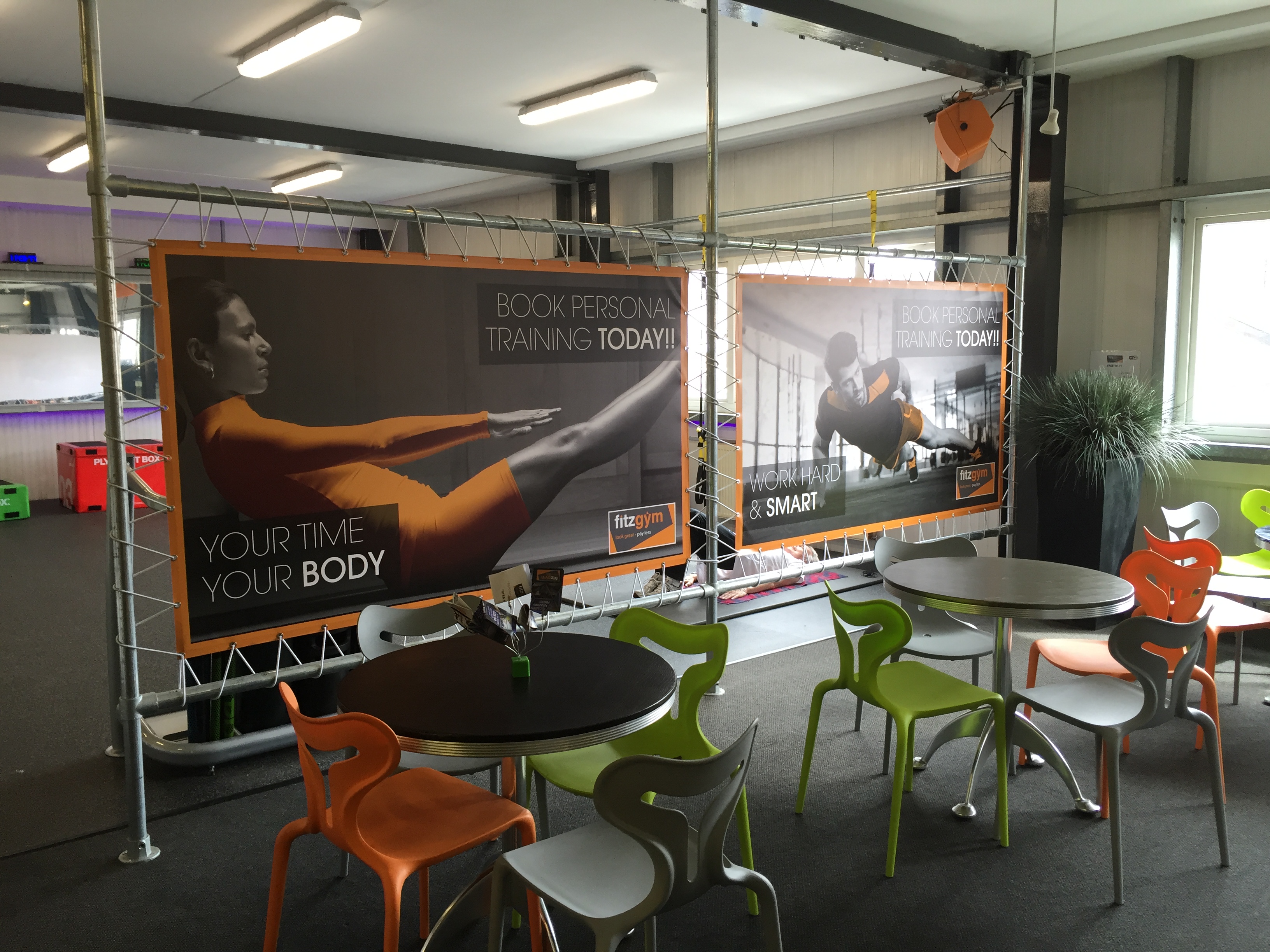 These large, digitally printed, full colour banners were used as partition walls to provide privacy to customers using a gym's training area. Each suspended on a steel tubular framework with bungee cords.