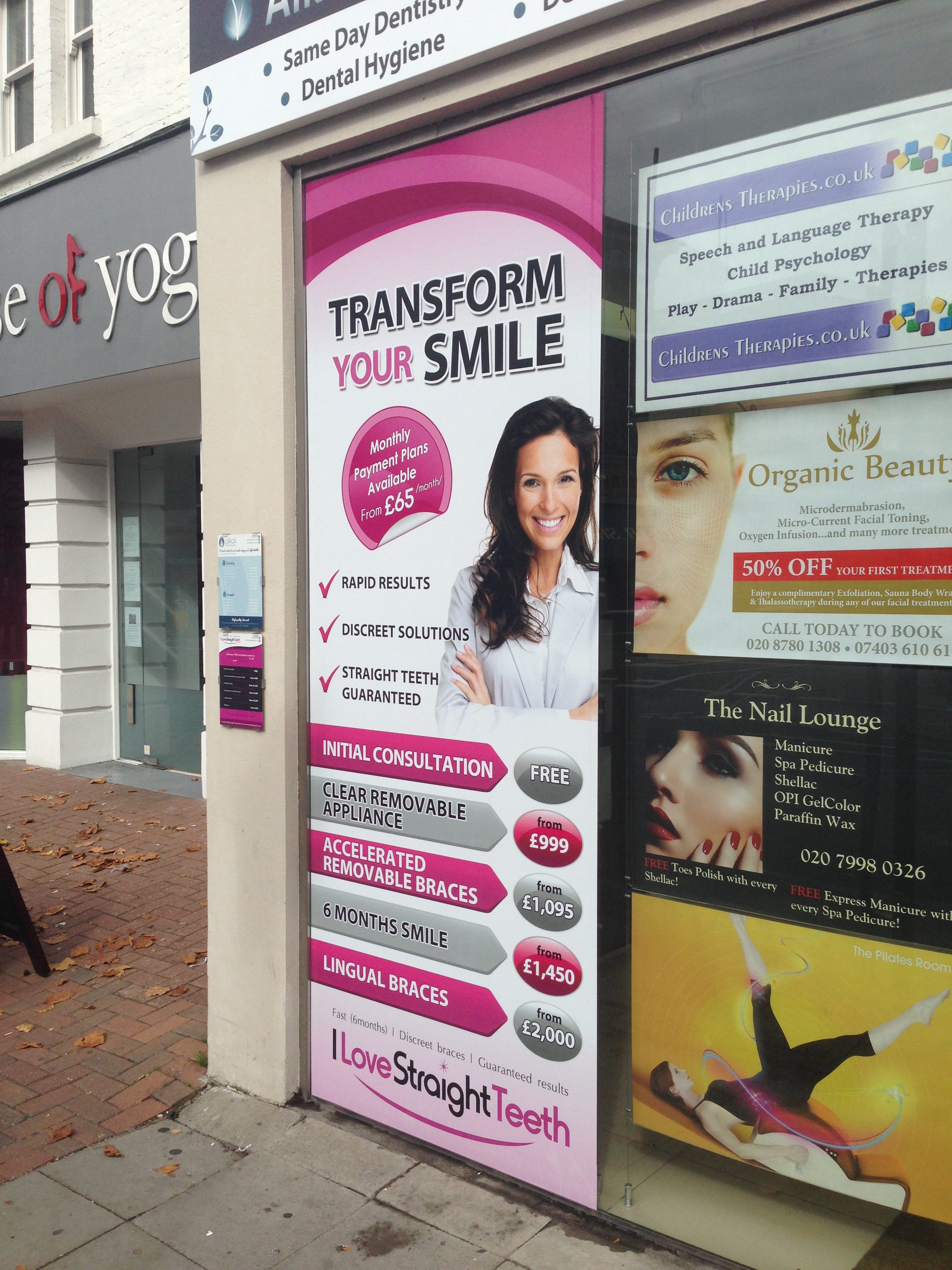 Full colour printed Window Graphics for dental practice shop window. Easily updatable window advertising window graphic printed and fitted to the outside of the glass shop front. Window Graphics Share this sign