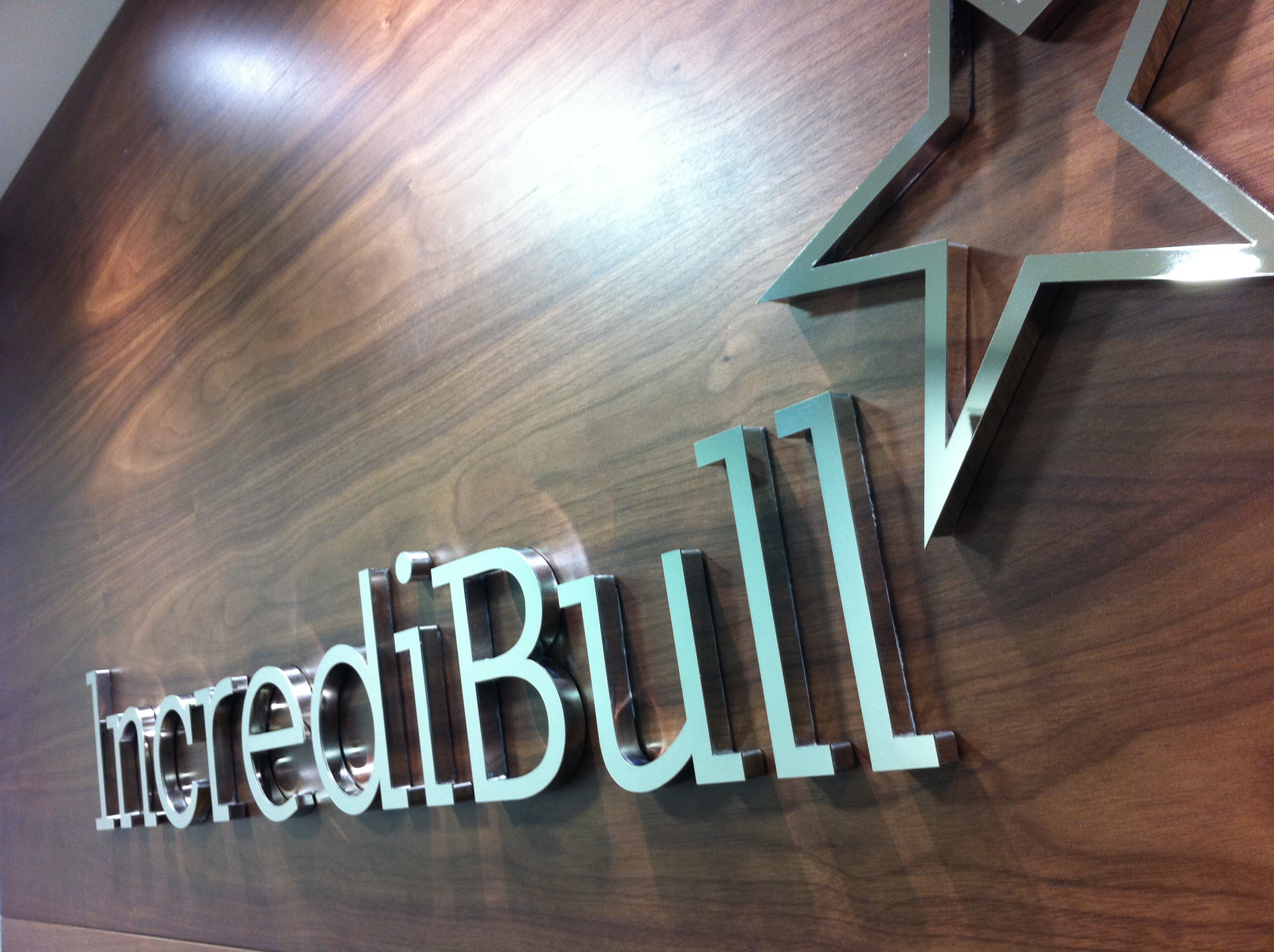 Built up fabricated letters Polished stainless steel letters mounted on walnut veneered wall panel. Corporate SignsReception signsMetal Signs3D Share this sign
