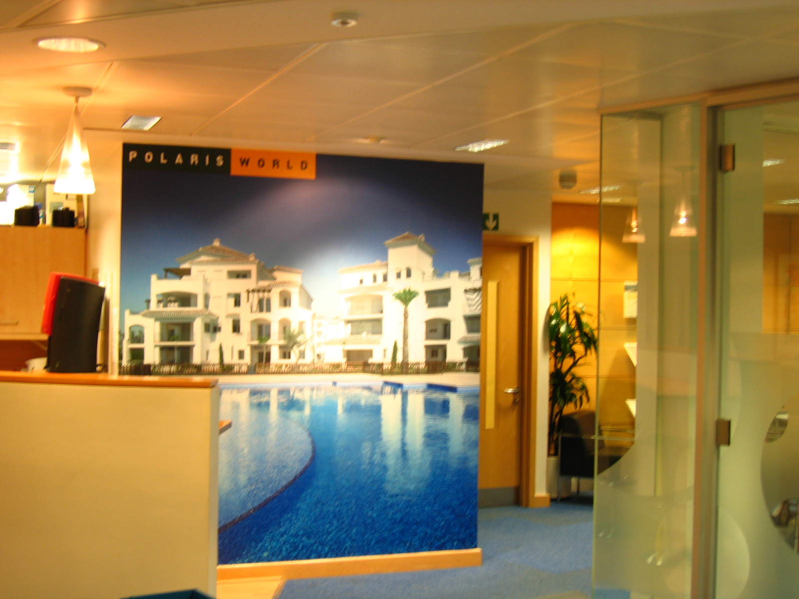 Internal Office Banner Signs Internal office banner signs with artwork supplied by client and installed in individual panels to create welcoming corporate entrance area. Murals and wallpaper Share this sign