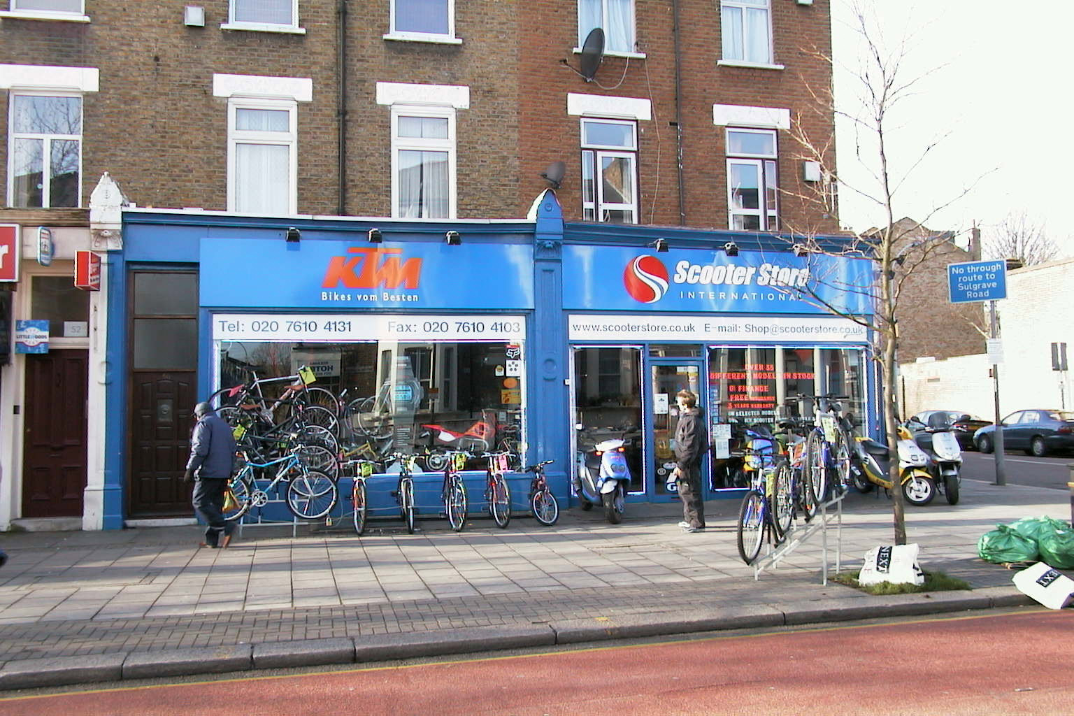 Vinyl graphics on blue shop fascia complimented by blue painted surround for London scooter shop.