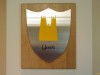 Shield shaped stainless steel panels mounted on wood for school houses.