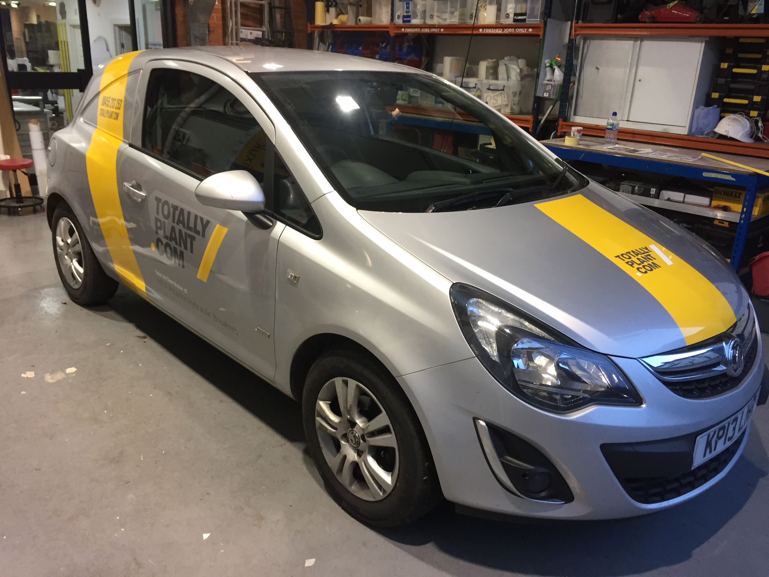 Totally plant small van graphics with iconic yellow branded stripe The vehicle graphics Bold yellow stripe wrapped around front and rear of the van to and corporate colours. red and yellow chevrons added to back. Plant and HaulageVan SignsChevron Share this sign