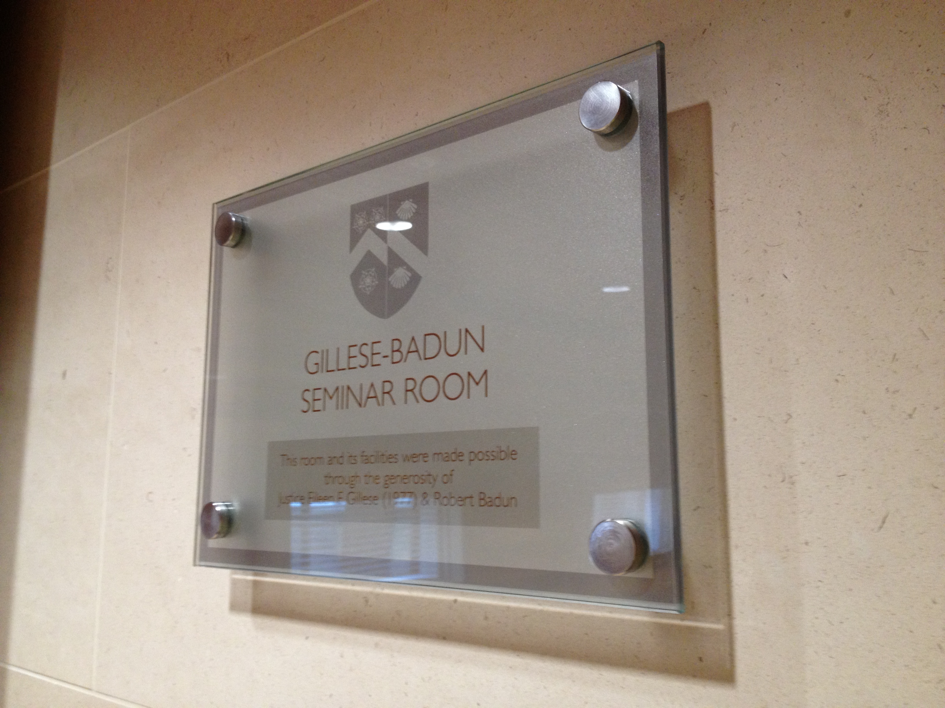 the small detail in the text and logos was achieved by printing onto optically clear vinyl this was then flood coated with a frosted film to provide contrast. The signs are installed at study rooms at Cambridge University.